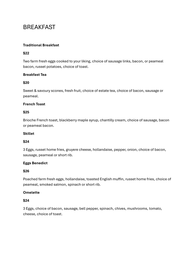 Sweet & savoury scones, fresh fruit, choice of estate tea, choice of bacon, sausage or peameal.