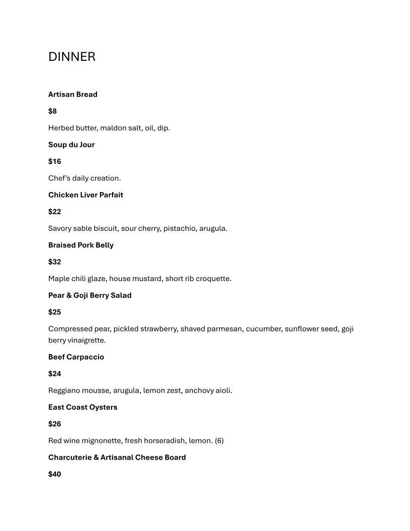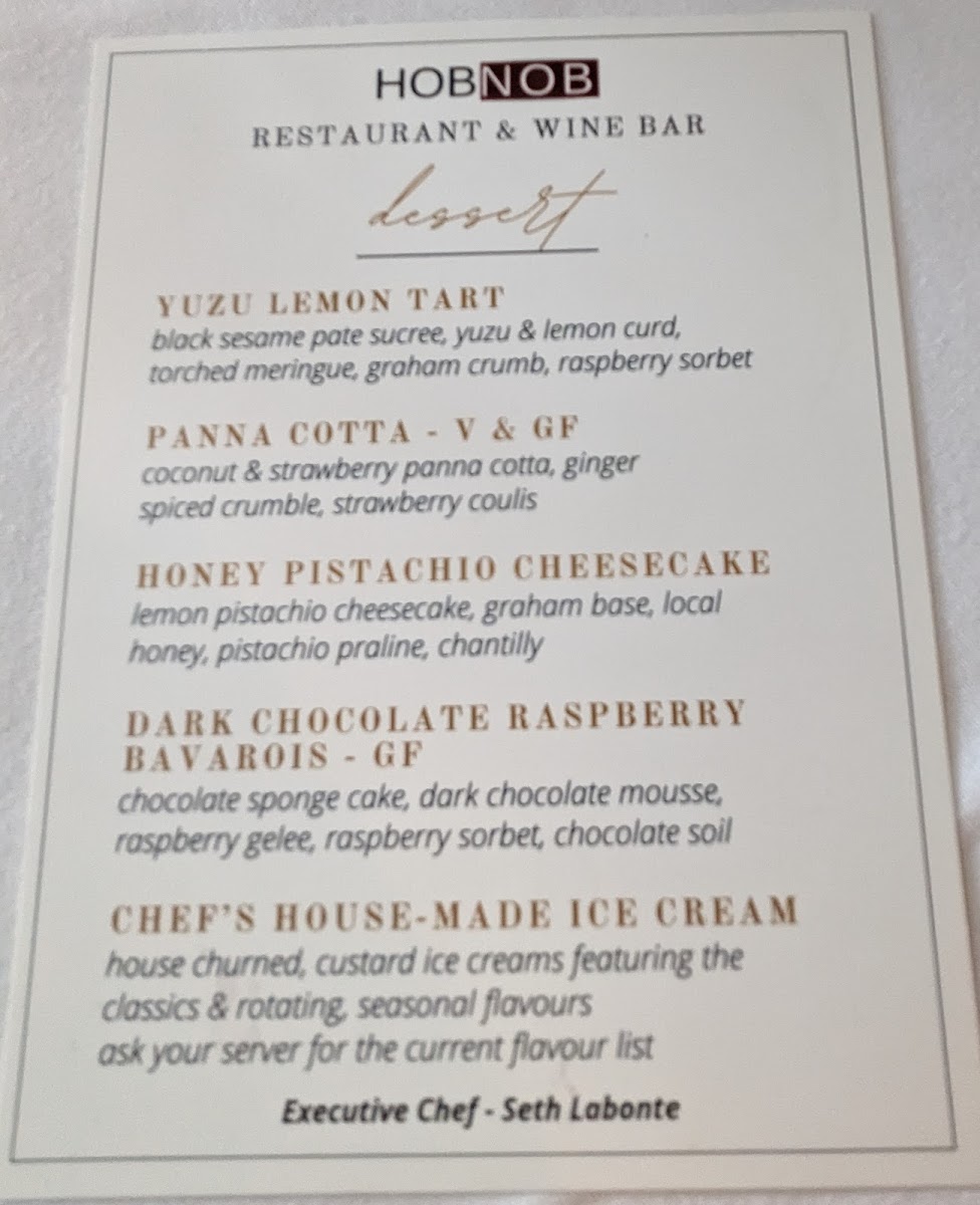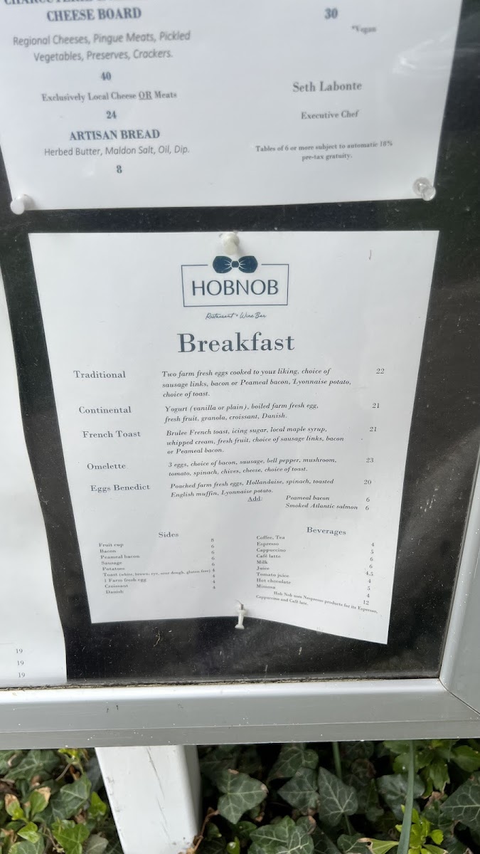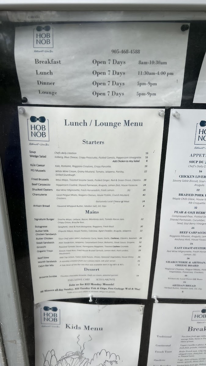 Welcome to HOB NOB Restaurant, a hidden gem nestled at 209 Queen St in Niagara-on-the-Lake, Canada. This culinary haven offers a thoughtfully curated menu that captures the essence of comfort and elegance. From the Pear & Goji Berry Salad featuring compressed pear and pickled strawberry, to the Signature Burger topped with sriracha mayo and crispy onions, each dish is a delightful experience. Guests rave about the flavorful Chicken Liver Parfait and the exquisite Beef Carpaccio, both of which reflect the restaurant's commitment to quality. Breakfast aficionados will adore the classic Eggs Benedict and the indulgent French Toast, making every meal feel special. The atmosphere complements the culinary experience, enhanced by warm hospitality and stunning decor. HOB NOB Restaurant not only satisfies the palate but also enriches every visit with memorable moments, whether for a celebration or a casual meal.