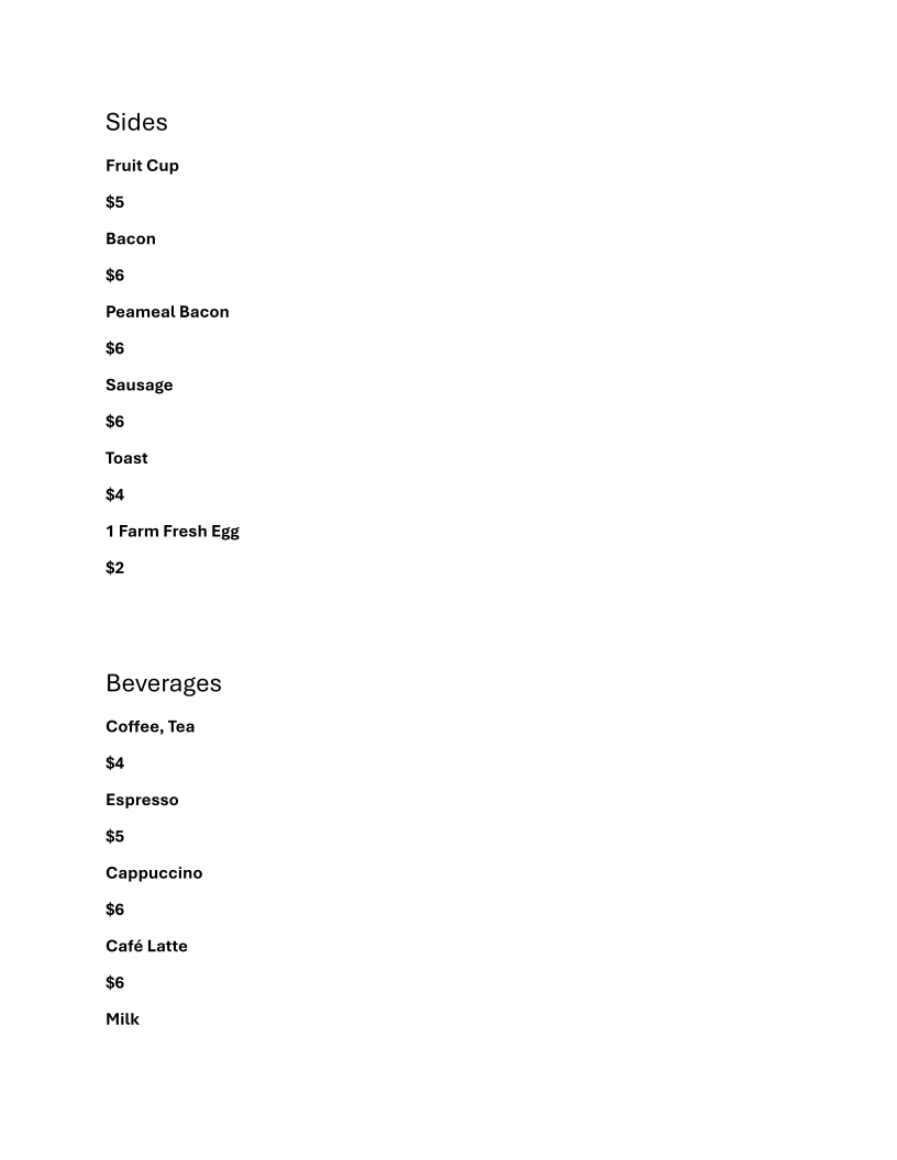 Two farm fresh eggs cooked to your liking, choice of sausage links, bacon, or peameal bacon, russet potatoes, choice of toast.